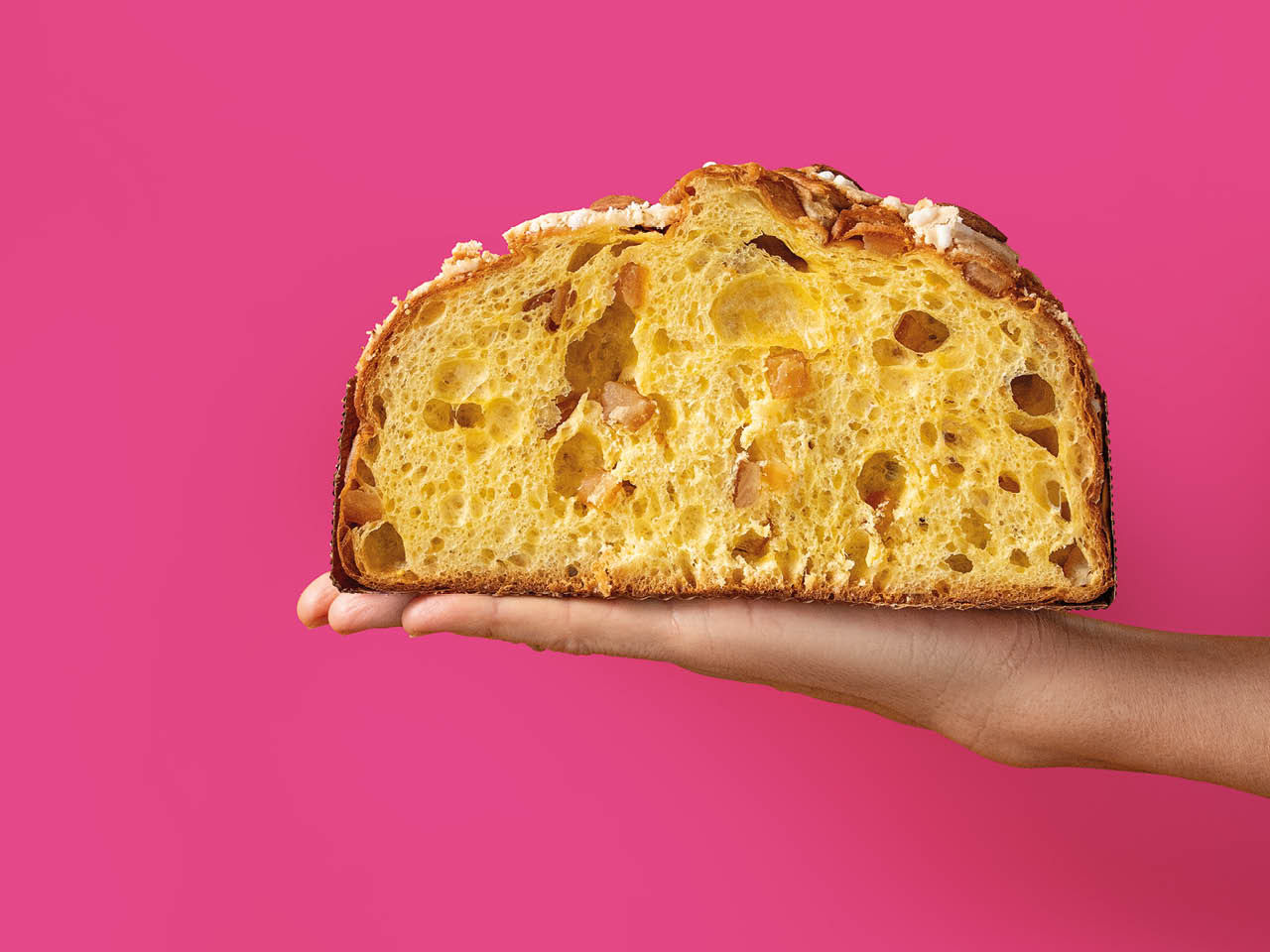 Élaborée exclusivement avec du levain naturel et de l’Huile d’Olive Vierge Extra Carli, sans beurre, elle est généreusement garnie de pêches confites (19%) et sublimée par un glaçage croquant aux amandes.